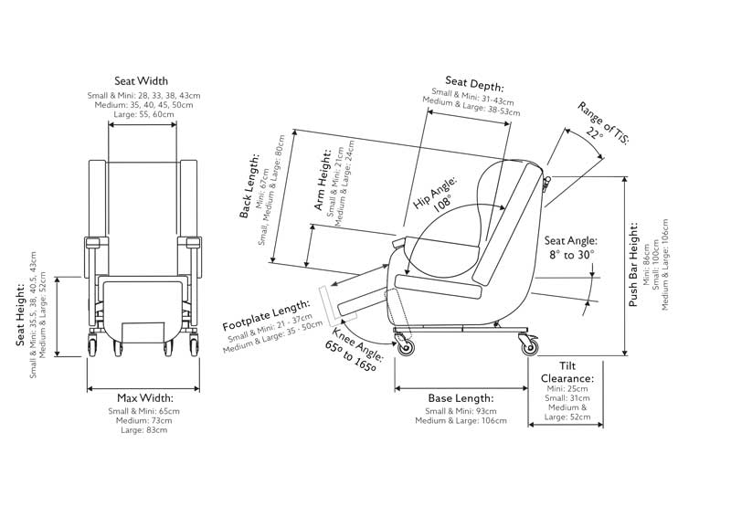 A versatile seating solution designed to cater to a wide range of individual needs, available in mini, small, medium, and large sizes. This chair can be customised with a variety of accessories, ensuring optimal comfort and support. The Tilt-in-Space feature improves pelvic alignment while maintaining hip and knee angles, promoting energy efficiency and facilitating effective pressure redistribution.